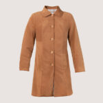 Abrigo para mujer, en gamuza, cuello alto, frente con botones, bolsillos, el forro es en paño lan a cuadros