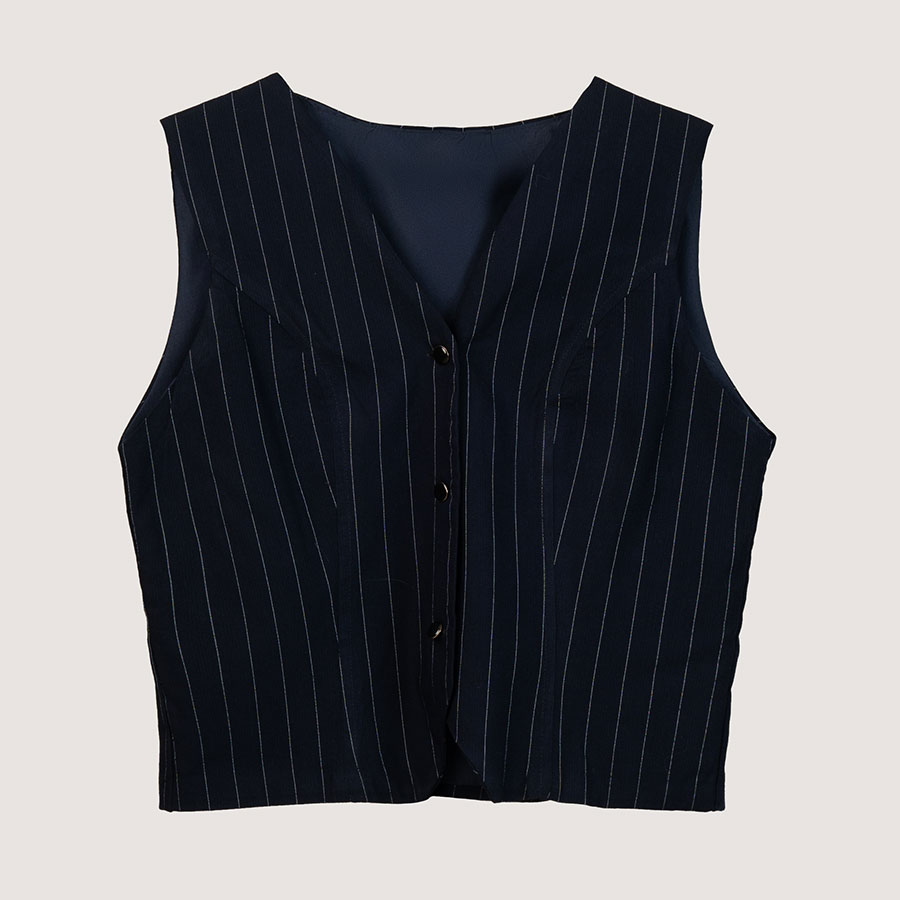 Chaleco para mujer en Lino rayatiza, cuello en v silueta amplia con botones del mismo tono